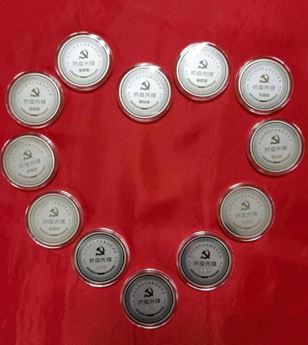 (上圖為獲得紀(jì)念章的黨員合集。“抗疫先鋒”紀(jì)念章由50g純銀打造,刻制專屬姓名和單位)